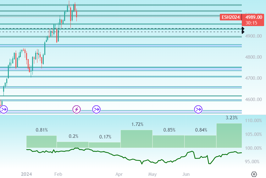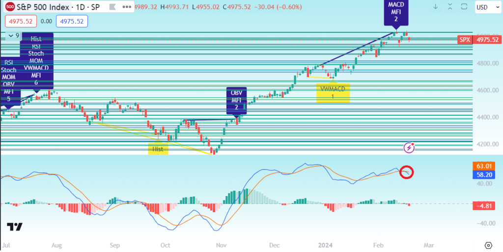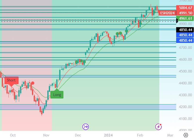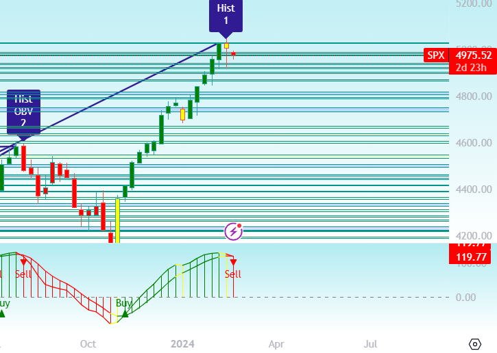 From a zone standpoint, SPY is sitting above the 495.58-496.07 support level. This level is weak and the only significant support remains $13 lower at 482.74-483.05, followed by $480. Structure remains weak while several indicators point to am imminent pullback. Being in negative gamma puts the markets further at risk of an accelerated pullback. We see the weekly bearish divergence from last week has stuck suggesting a multi-week pullback ahead. We also see the RSI/TSI overbought/oversold indicator flashing a sell signal now for a multi-week pullback. I remain in my short position of 23 ES shorts, 7 NQ shorts, 1 SPX put, 10 QQQ puts.