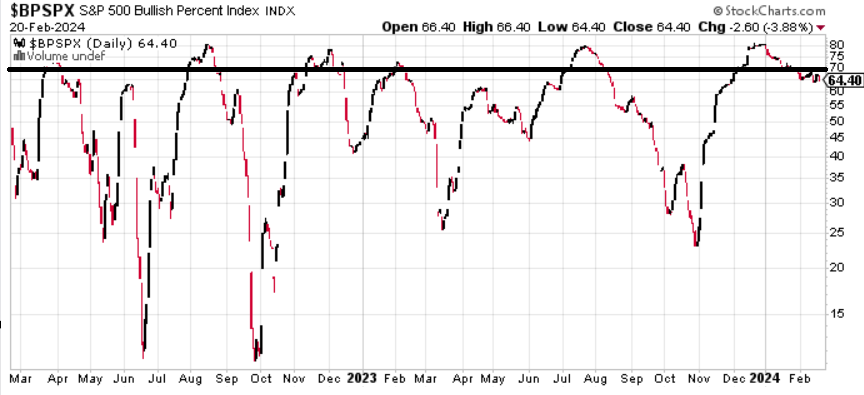 The SPX bullish percentage index remains on a sell as it stays below 70 after crossing above. This has almost always led to significant pullbacks in the past.